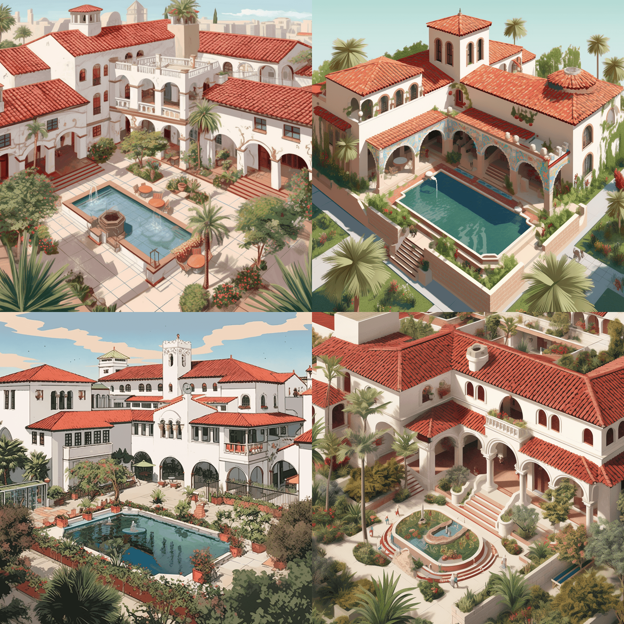 Prompt 2: “A building in the architectural style of mission revival, with red roofing, fun terrazzo tiles, the size of a skyskraper. White arches. A spanish courtyard on the roof with a pond and lots of plants”
