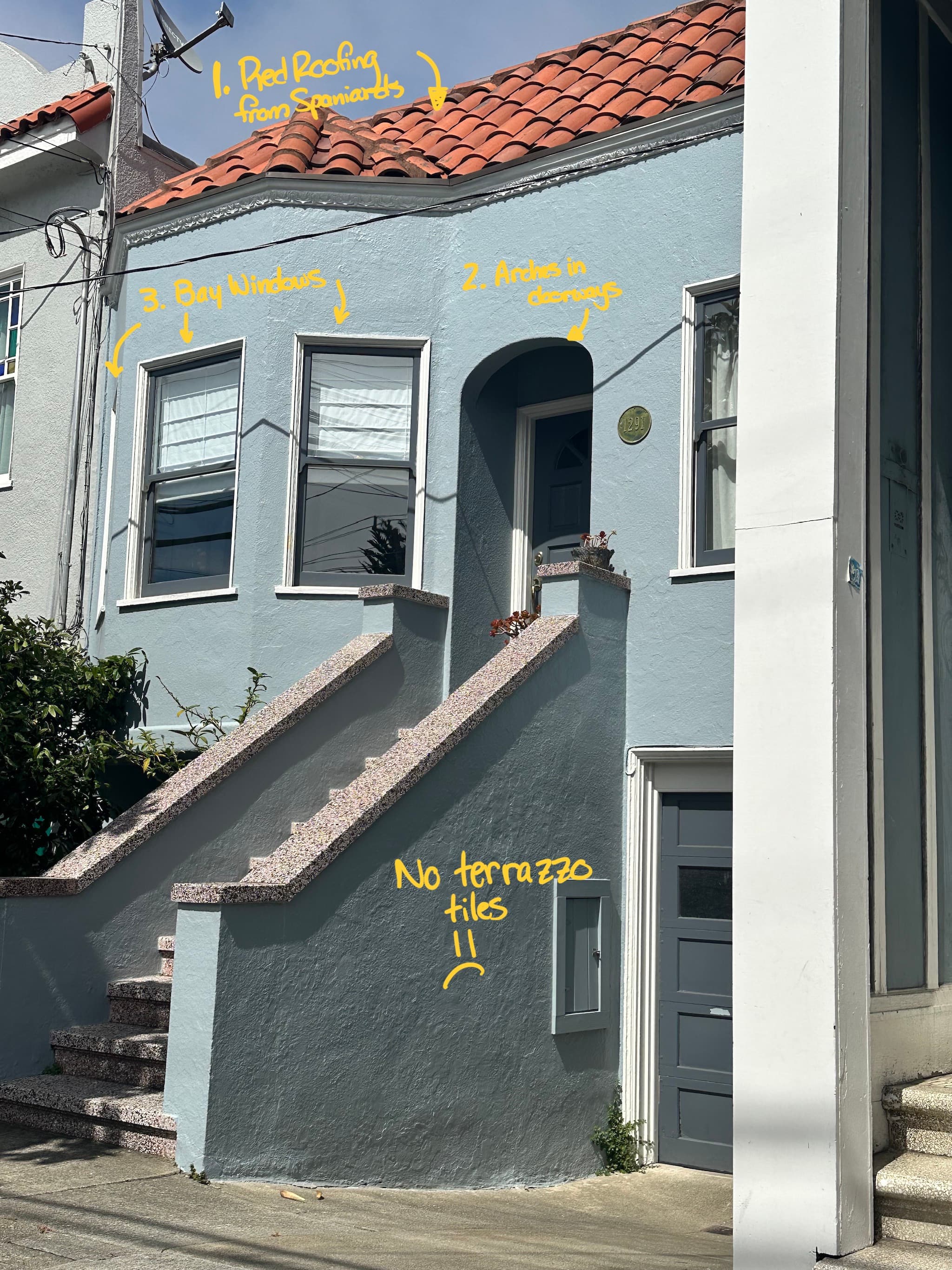 The house I saw was more Mission Revival, which is characterized by red roofing brought over from the Spaniards, arches in the doorway, bay windows (those 3 panel windows), and fun terrazzo tiles.