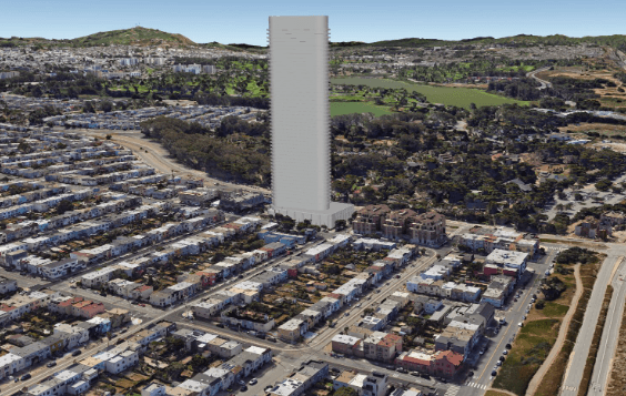 My goal is to learn what these characteristics are and then use an image generation model to generate new images of a "californian skyscraper" because we can do so much better than this lame proposal for the sunset neighborhood of San Francisco, which belongs back in the powerpoint it came from: